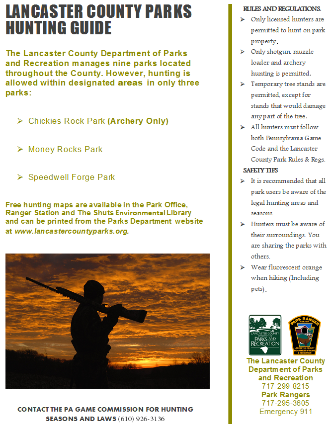 The Lancaster County Department of Parks and Recreation is committed to improving the well being of County residents by providing facilities and programs that encourage participation in outdoor activities and foster personal action for the conservation of natural resources. With six region parks and three recreational trails, the department manages a total of 2,055 acres. Regional parks range in level of development from Central Park's more urban setting to the Theodore Parker Natural Area's rural setting in the woodlands along Stewart Run in the southeastern part of the county. All county parks and services are also open to non-residents.